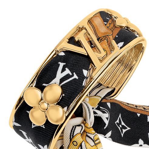 The strikingly original LV Initials Silk Bracelet combines the precious radiance of gold-coloured metal with the opulence of plush silk. A finely crafted cuff integrating the House’s iconic Monogram Flowers and LV Initials is threaded with a removable silk Monogram bandeau. An eye-catching bracelet and a unique way to wear the Louis Vuitton signature.