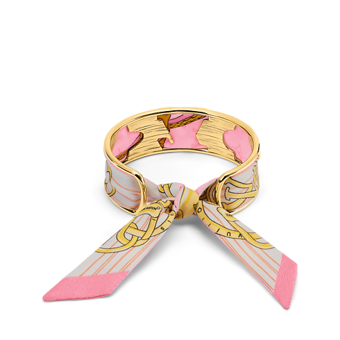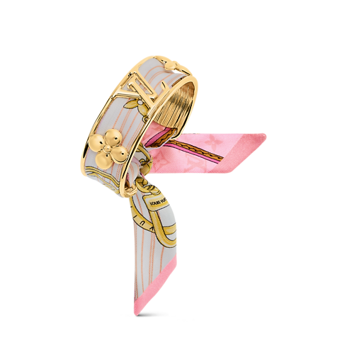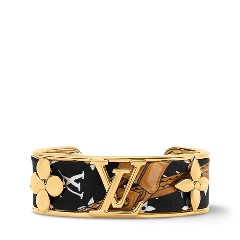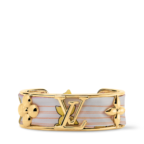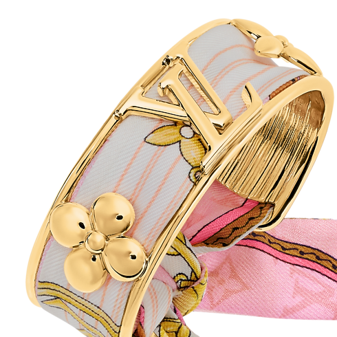 The strikingly original LV Initials Silk Bracelet combines the precious radiance of gold-coloured metal with the opulence of plush silk. A finely crafted cuff integrating the House’s iconic Monogram Flowers and LV Initials is threaded with a removable silk Monogram bandeau. An eye-catching bracelet and a unique way to wear the Louis Vuitton signature.