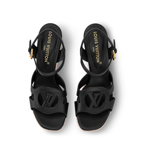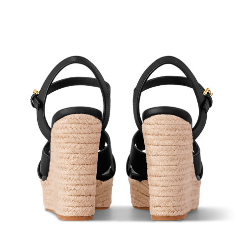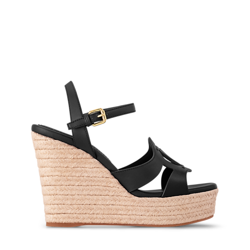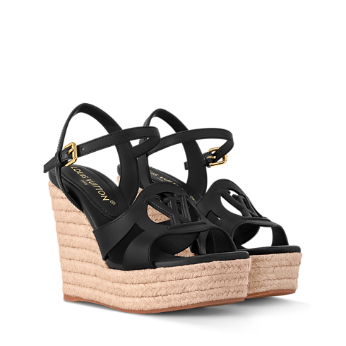The LV Isola Wedge Sandals combine an upper in smooth calfskin with a comfortable braided-rope sole, which references the classic espadrille. The distinctive LV Circle motif, which is cut out of the upper, is the signature of the LV Isola line. This relaxed yet elegant model is fastened around the ankle with a gold-tone buckle.