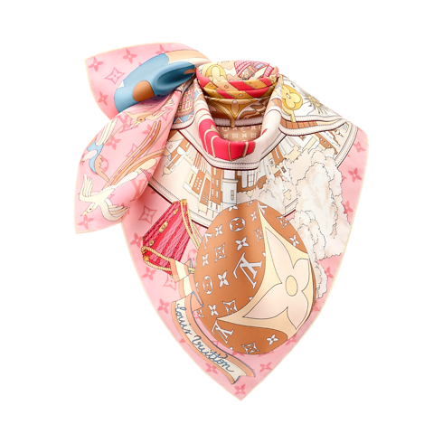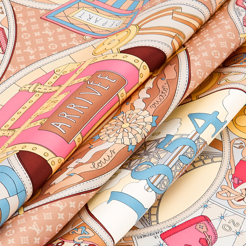 The LV Journey silk square embarks on an extraordinary adventure in the world of travel. Its intricate, playful print combines images of luggage, hot air balloons, trains, ships and aeroplanes with dice, clouds and the house’s signature Monogram and Damier motifs. The striking, timeless design is sure to make this an iconic accessory.