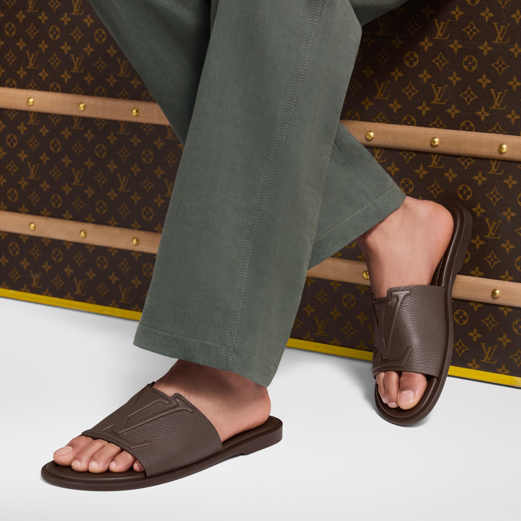 The LV Portofino Mules showcase a casual-chic style made of supple, grained calf leather. They have wide front straps featuring distinctive V-shaped cut-outs and raised LV Initials signatures. This model has a leather insole stamped with the LV Initials and a rubber outsole bearing the Louis Vuitton signature.