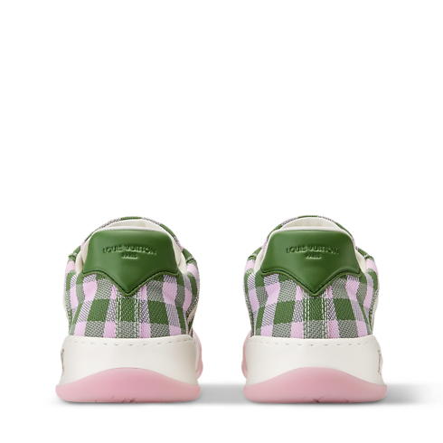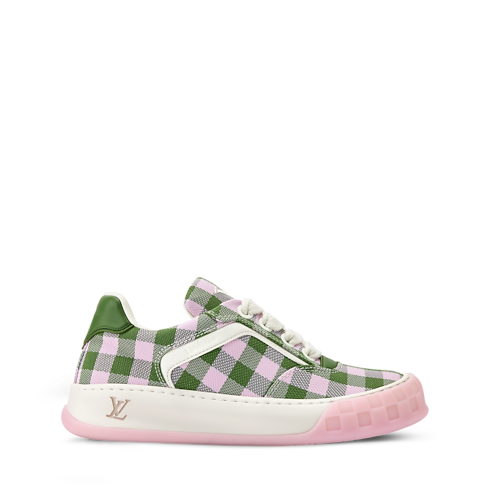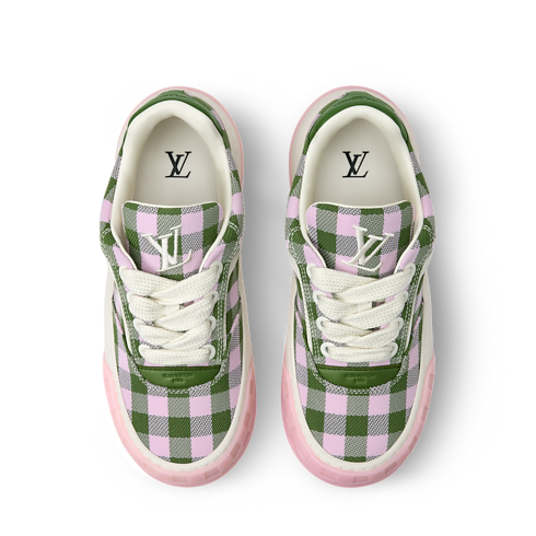 The LV Tilted Trainers come in a mix of materials with a colourful gingham print, a key motif of the season. Inspired by vintage trainers and skate shoes, this model is named for the tilted LV Initials on its tongue and outsole, which evoke the motion of skateboarding. Other distinctive details include the Damier pattern on the two-tone outsole.