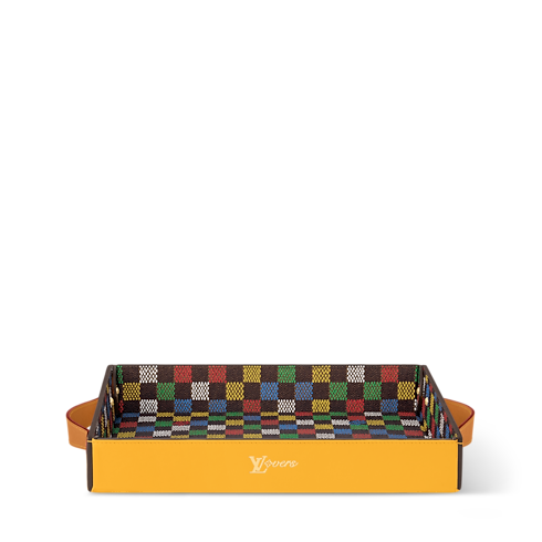The LV Vers Damier Tray is a bright accessory that is as practical as it is playful. The outside of the bold yellow tray is equipped with leather handles and the LV Vers signature and the interior shows the cheery rendering of the Damier motif. This is a treasure that is meant to stay out in the open.