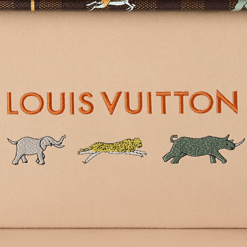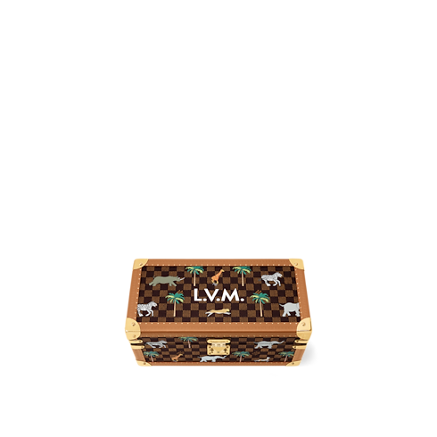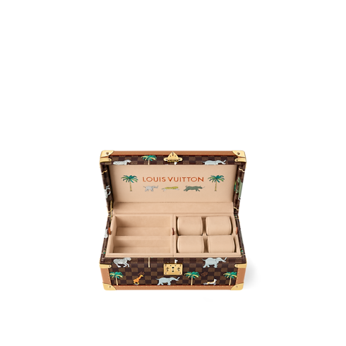 The LV x The Darjeeling Limited Coffret Accessoires is made from Damier Ebene Heritage canvas, adorned with vibrant animals and palm trees in a style evocative of the film. Designed for sunglasses, watches, belts and jewellery, it includes removable cushions and numerous compartments. The inner lid is embroidered with matching animal motifs.