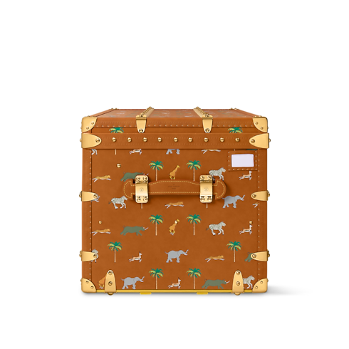 Inspired by the film, LV x The Darjeeling Limited Courrier Lozine 90 is crafted from elegant tan brown leather with a vintage allure. Colourful illustrations of animals and palm trees create a preppy yet naïve aesthetic, echoing the movie’s captivating, nostalgic universe. The trunk is numbered '11' to echo the movie.