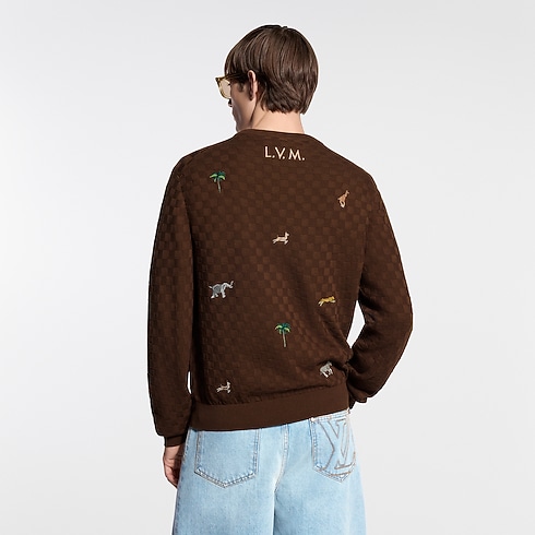 This long-sleeved cotton crewneck features a tone-on-tone textured Damier knit in a rich brown colour. It is embellished with the Spring-Summer 2026 Show’s iconic LV x The Darjeeling Limited motif, which celebrates the art of travel with vibrant embroidered depictions of various animals. A leather signature patch on the back completes this graphic clothing piece.