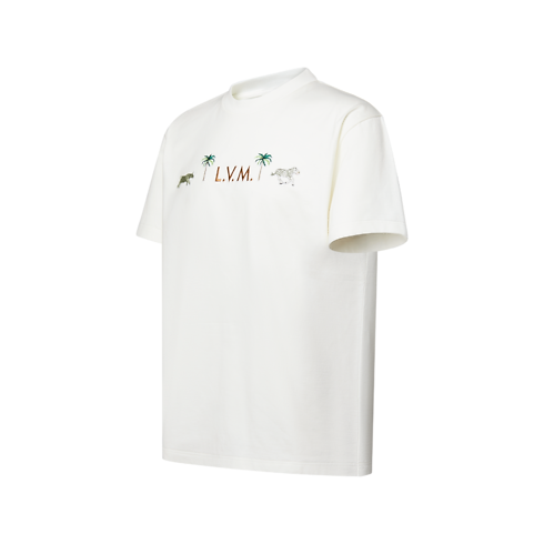 This classic short-sleeved crewneck in milky white organic cotton is embroidered with signatures from the Spring-Summer 2026 Show. 3D L.V.M. lettering on the chest, inspired by the House’s heritage trunks, is framed by intricate palm trees and animals from the LV x The Darjeeling Limited motif.