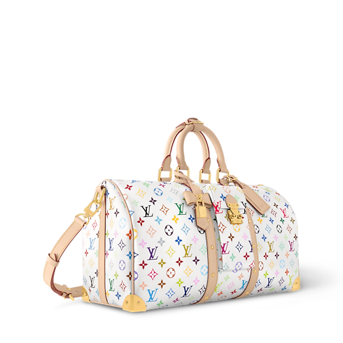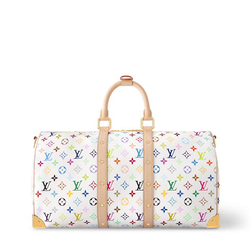 The emblematic Keepall Bandoulière 45 bag makes a vibrant statement in multicoloured Monogram coated canvas from the re-edition of the Louis Vuitton x Murakami Collection, which revisits the House’s classic signature with the Japanese artist’s playful rainbow palette. A front pocket with an S-lock closure and gleaming metallic corners add an emblematic touch, while studded bands and a bow-shaped key bell complete the look with a seasonal flourish.