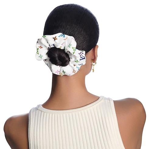The LV x TM Monogram Multicoloured Chouchou (French for 'scrunchie') hails from the season’s exclusive collection designed in collaboration by Louis Vuitton and noted Japanese artist Takashi Murakami. This pure silk hair accessory is printed with Murakami’s colourful take on the House's emblematic Monogram motif, featuring 33 vibrant hues. A fun, feminine piece, it is finished with a golden LV Circle charm. A perfect match for the bags, shoes and fashion jewellery offered in the Louis Vuitton x Murakami Collection.