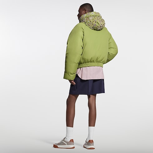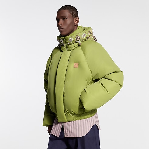 This vibrant green down jacket is a Made to Order runway piece drawing on the Spring-Summer 2026 Show’s chic mountaineering theme. The relaxed, enveloping silhouette is crowned with a jewel-encrusted hood, inspired by India’s artisanal heritage, featuring thousands of meticulously hand-embroidered crystals and beads. A VVN-coloured leather signature patch on the chest completes this standout clothing piece.