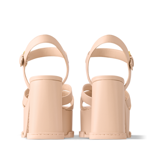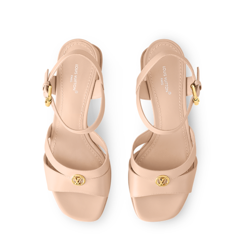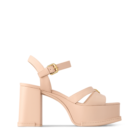 The Maya Heeled Platform Sandals come in smooth calf leather, which also cover their block heels and chunky platforms. A key feature of this model is its protruding sole, which creates a distinctive profile. The front strap is signed with a gold-toned LV Circle accessory, while the ankle strap is fastened with a neat, square buckle.