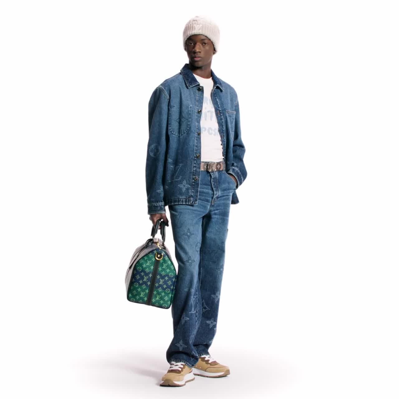 These organic denim workwear trousers have an easy relaxed fit and a washed vintage finish. They are adorned with a Monogram Seeds motif in a sophisticated tonal gradient effect. Workwear details include side pockets and a hammer loop, while a leather Damier jacqueron at the back is signed with an embossed LV. A matching overshirt makes a graphic set.