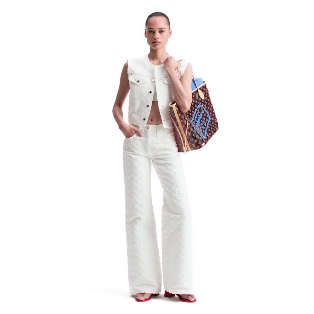 A textured, tone-on-tone Monogram fil coupé signature uplifts these jeans with a fresh, summery spirit, while plain inserts add a subtle contrast to the pockets and back. They are cut from structured cotton in a flattering high-waisted bootcut shape, complete with chic gold-colour hardware and an oversized leather belt loop.