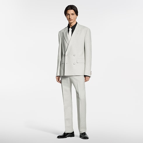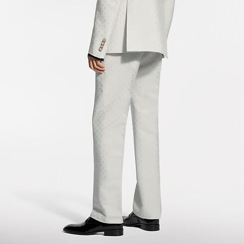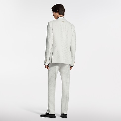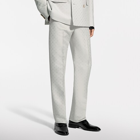 These tailored evening trousers stand out from the crowd in a pale ivory hue for summery celebrations. Crafted in a luxurious blend of silk and mohair, they are adorned with a tone-on-tone jacquard Spaced Mini Monogram motif, which is expressed in a subtle play of matte and lustrous textures. A matching double-breasted jacket makes a sharp suit.