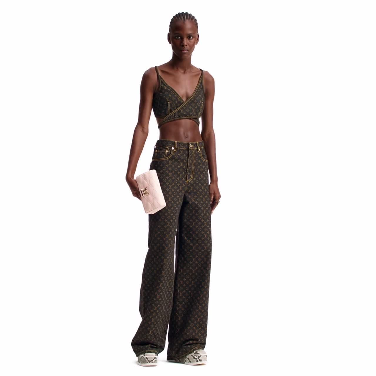 These staple jeans are elevated for the season with the collection’s laser-printed Monogram motif featuring as a chic all-over signature, inspired by the House’s archival travel trunks. They are cut in a timeless straight-cut shape. Contrasting yellow topstitching emphasises the structured, vintage look, while understated carpenter loops on the back pockets nod to utility styles.