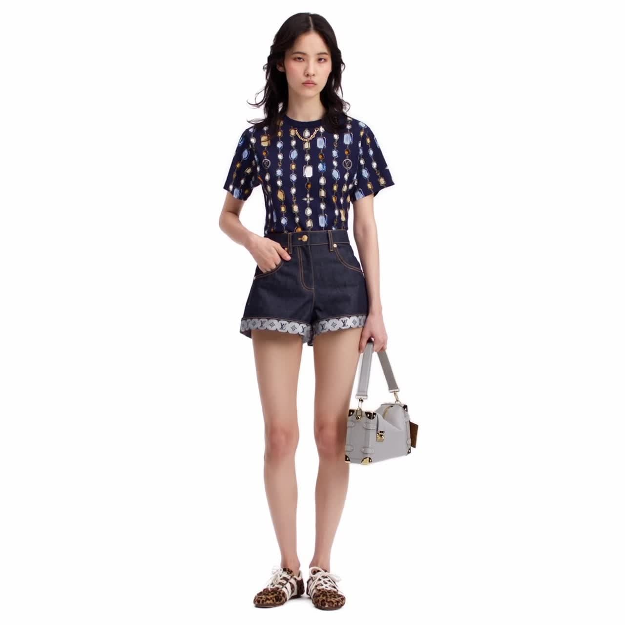 This classic T-shirt is uplifted with an all-over necklace print, which elegantly combines signature Louis Vuitton charms with an array of precious gemstones in refined seasonal shades. It is made from soft, comfortable cotton jersey in a classic fit. An LV chain embellishment adds a playful jewel-like accent to the crew neckline.