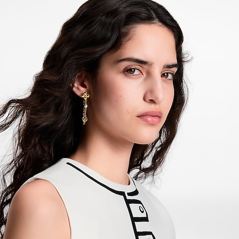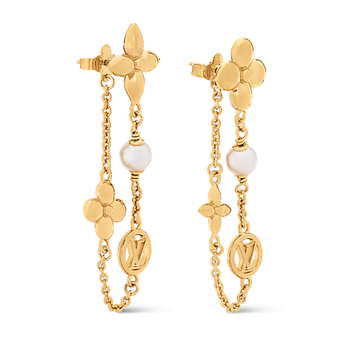 The sophisticated asymmetrical design of the Pearl Constellations Earrings captures the magic of a star-filled night sky. Each earring combines two Monogram Flowers and an LV Circle emblem with a gleaming resin pearl on a delicate gold-toned chain. Infused with subtle elegance, these feminine jewels add a touch of celestial magic to any look.