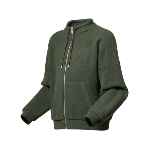 Casual yet elegant, this loungewear-inspired blouson is perfect for travelling, crafted from warm, softly textured wool fleece in timeless olive green tones. The sporty tailoring features a tall, drawstring-adjusted collar and raglan sleeves with ribbed elbows for ease of movement. Topstitching creates a smart, quilted effect with an embroidered LV on the chest. Matching trousers make a cosy set.
