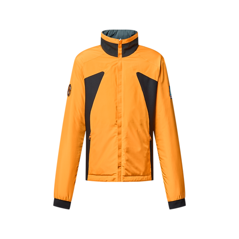 This lightly padded technical mid-layer is a versatile style that can be worn alone or under a ski shell jacket. It is reversible, with one side in neutral grey tones, while the other brings a pop of bold orange to a look. Black side panels on the grey side are printed with a tone-on-tone all-over Monogram, while embroidered ski-themed signature patches on the orange side create a retro sporty mood.