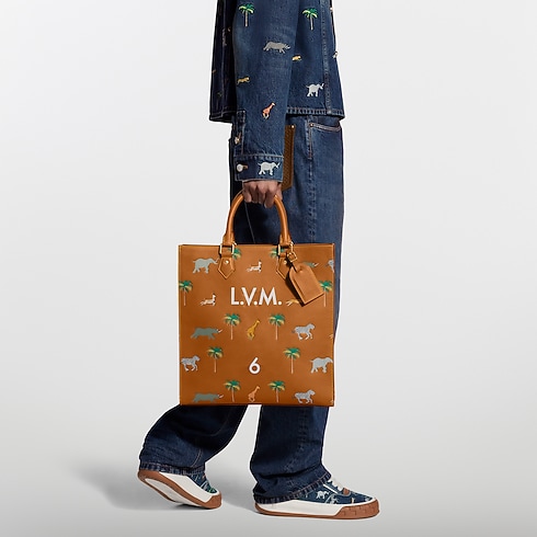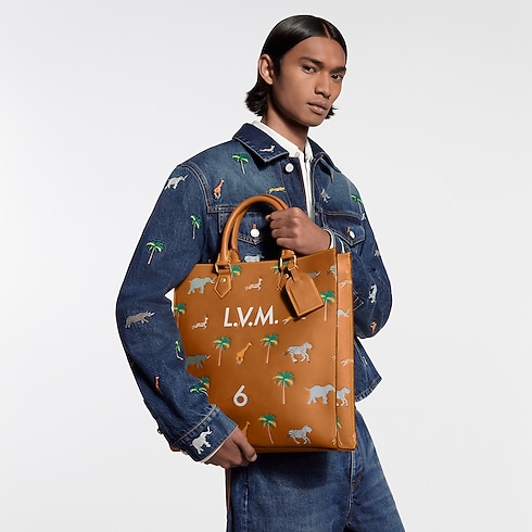 The spacious Sac Plat bag is made from naturally tanned calf leather with a sfumato finish, animated by wild animals racing across the bag in a motif inspired by The Darjeeling Limited film. It features the iconic screen-printed number from the film alongside 'L.V.M.' initials and is lined in an LV Blason textile.