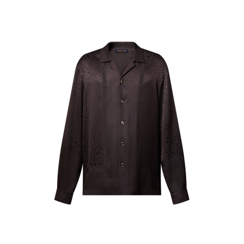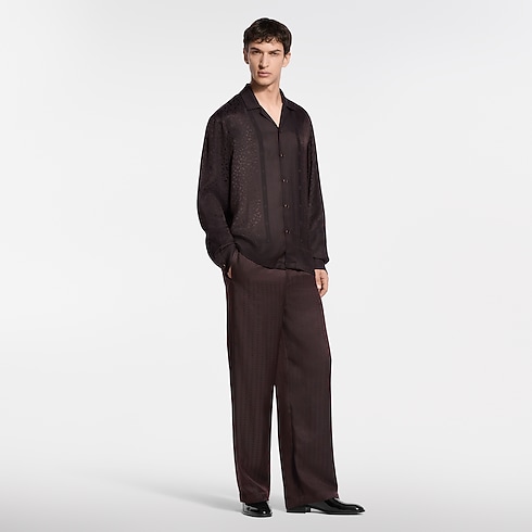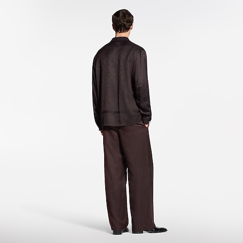 Richly embellished like a scarf, this fluid silk-blend pyjama shirt in rich brown tones is elevated with this collection’s LV Cheetah jacquard, with discreet Monogram signatures integrated into the graphic feline pattern with a lustrous play of textures. The flowing, relaxed silhouette makes a comfortable and chic evening set paired with matching trousers.