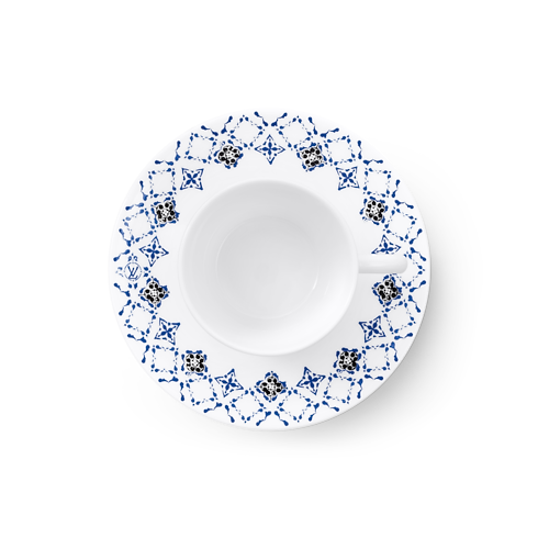 The pattern of the LV By The Pool set of two coffee cups and saucers offers an artistic update of an emblematic House signature. Finely rendered in blue on extra white Limoges porcelain, their mosaic-like pattern of Monogram Flowers recalls a look from Louis Vuitton's Ready-to-Wear Resort Collection. These exceptional cups and saucers bring a touch of distinctive elegance to morning or after-dinner coffee.