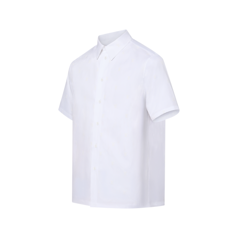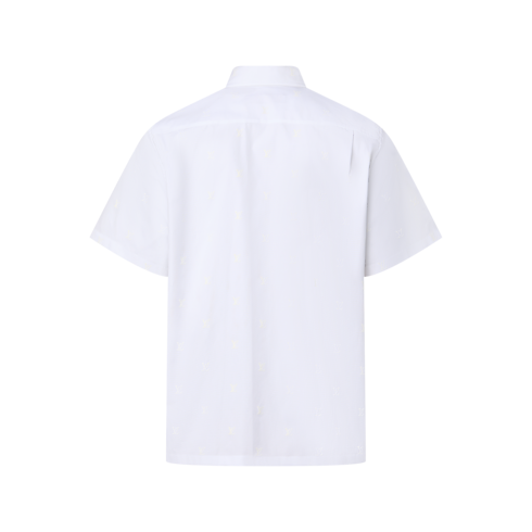 This white Short-Sleeved Cotton Oxford Shirt is embellished with a tonal all-over LV Blason print. This versatile piece elevates everyday looks, but can also complete an elegant contemporary set with the same signature on a jacquard blouson and chinos.