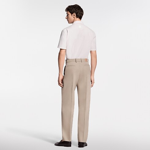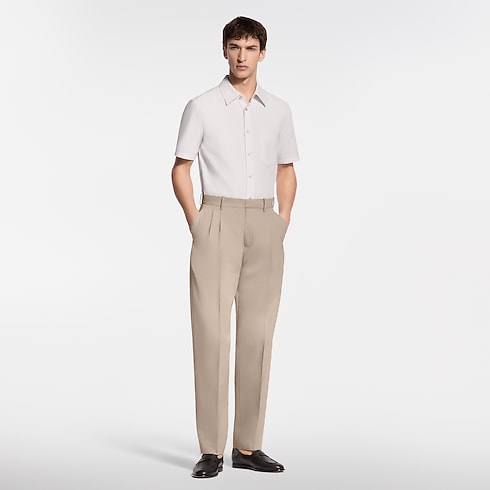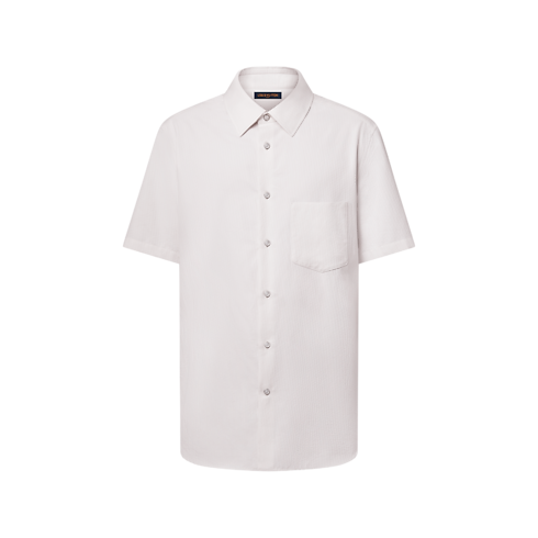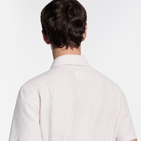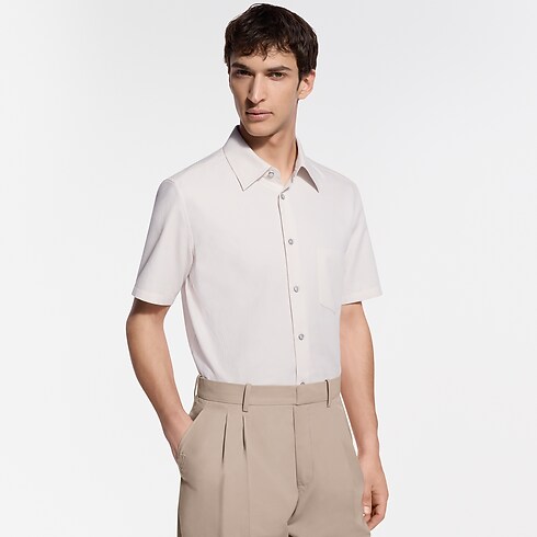 This ivory-toned short-sleeved shirt is a fresh option for warmer days. The fine, organic cotton is adorned with a jacquard LV Interlocked motif. Additional signature details include an LV button on the collar and woven signature labels on the button placket and the back. This clothing piece can be paired with a suit in the same motif.