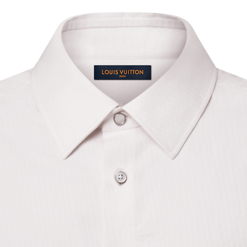 This ivory-toned short-sleeved shirt is a fresh option for warmer days. The fine, organic cotton is adorned with a jacquard LV Interlocked motif. Additional signature details include an LV button on the collar and woven signature labels on the button placket and the back. This clothing piece can be paired with a suit in the same motif.