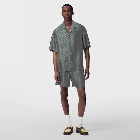 This open collar shirt in a fluid silk blend has an easy relaxed fit. Inspired by this collection’s nautical world, it is crafted from an LV Fishnet jacquard with pale green LV signatures on an elegant grey background creating an iridescent graphic effect. This refined piece has matching shorts for a sophisticated day-to-evening look.
