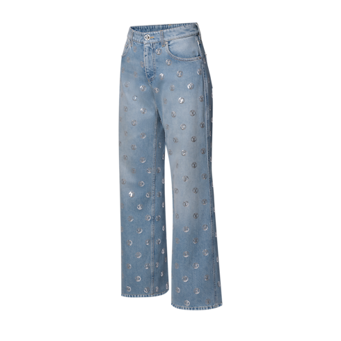 A statement spin on a staple clothing style, these jeans are comfortable and flattering for versatile wear in a classic high-rise straight shape. LV Circles embroidered in shimmering metallic sequins add a playful all-over signature, as well as a graphic cut-out button on the fastening and an oversized LV Circle on the back pocket.