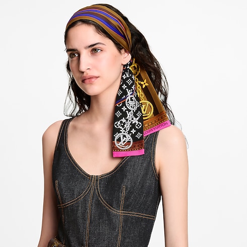 The bold design of the Strap and Trunk Bandeau was inspired by the look of historic Monogram luggage from the 19th century. Printed on pure silk, it features a trunk-style leather strap plus a chain adorned with emblematic Louis Vuitton charms. This elegant, eye-catching accessory is a tribute to the House’s heritage in the art of travel.