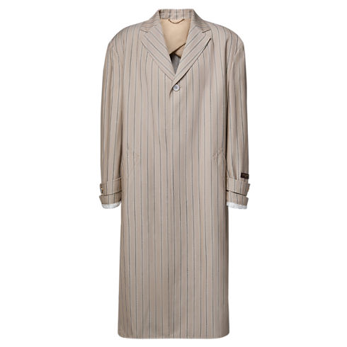 This lightweight belted coat embodies the Spring-Summer 2026 Show’s laid-back elegance. Softly structured with drop shoulders, it is crafted from a fluid wool-silk jacquard with heritage stripes in beige and camel tones and features a leather signature patch on the left sleeve. A refined match for this season’s subtle hues, it has a corresponding jacket for a layered runway look.