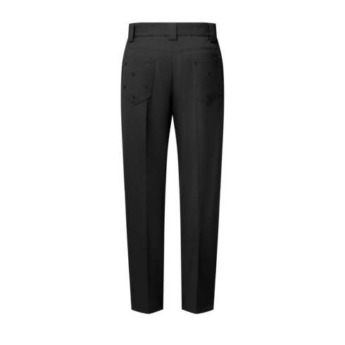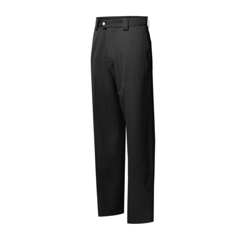 These versatile black carpenter trousers complete smart and casual looks with their elegant take on a workwear classic. Their regular silhouette with double knees is crafted from fine wool twill tailoring fabric. LV Blason embroidery in lustrous tone-on-tone yarn elevates the rear pockets, while a pearl-effect button closure adds a chic finishing touch.