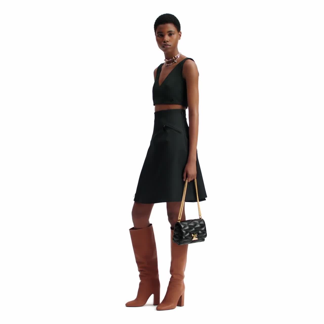 This mini skirt is smart and streamlined in an unfussy A-line silhouette with a flattering, exaggerated high waistband. It has a modern tailored feel in the House’s iconic technical gabardine, complete with a zipped side pocket trimmed with an LV Circle zip pull. An embossed leather tab adds a final signature detail to the hemline.