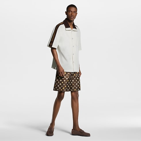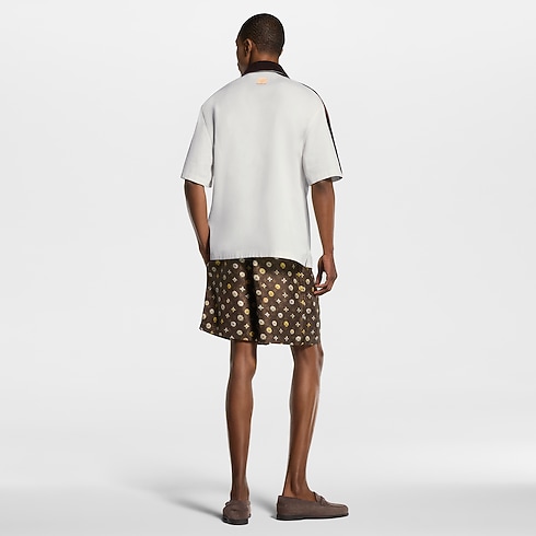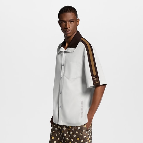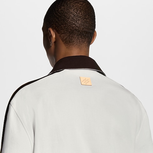 Dark brown ribbed inserts lend a graphic accent to this short-sleeved white cotton pique shirt. Signature-embroidered bands adorn the shoulders and sleeves, while the brown collar can be buttoned up like a turtle neck or worn open. Embroidered Louis Vuitton lettering on the left torso adds a sporty touch. Mix and match with this collection’s flowing trousers or shorts for a preppy look.