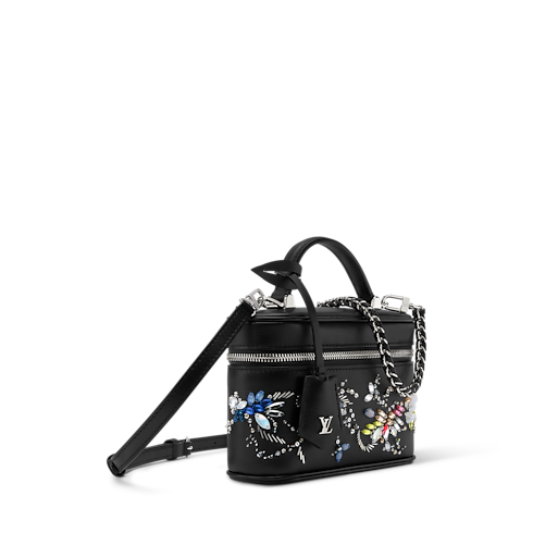The Eden Collection presents this glamorous iteration of the Vanity Chain Pouch, defined by exquisite embroidery. Adorned with multicoloured gems and rhinestones, it is crafted from calfskin in a classic black colourway and includes a braided gold-colour chain that can be removed if desired. The leather address tag pays tribute to the House’s iconic travel heritage and expertise.