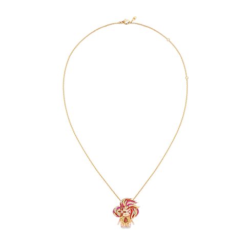 The Vivienne Rooster Pendant portrays the House’s ever-playful mascot as an animal from the Chinese zodiac. Her pink gold face is adorned with a yellow gold beak and red spinel eyes, plus feathers in red and pink lacquer streaming with diamonds. It is an exquisite collector’s piece.
