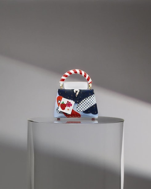 Playfully reinterpreting the Maison’s codes through a kaleidoscopic lens, Wang’s mini-Capucines, the smallest Artycapucines created yet, combines a graphic motif reminiscent of the iconic Damier with chromatic adornments. Imbued with whimsy, the creation is evocative of candy wrappers and sweets.