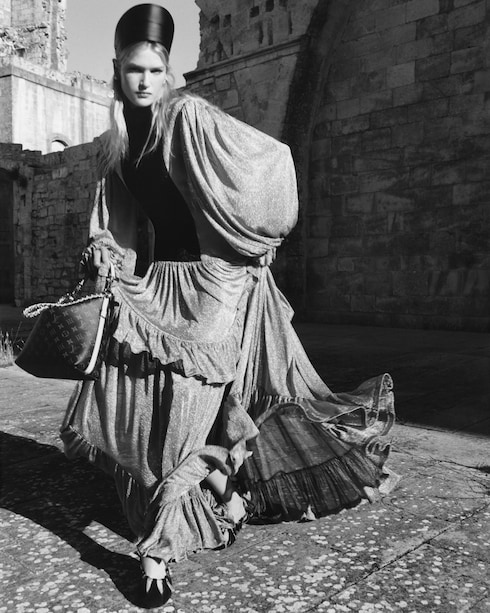 Dalam pertemuan penuh kilau lintas zaman, kemegahan Abad Pertengahan berpadu dengan pesona glam rock yang berani untuk Koleksi Cruise 2026 rancangan Nicolas Ghesquière.